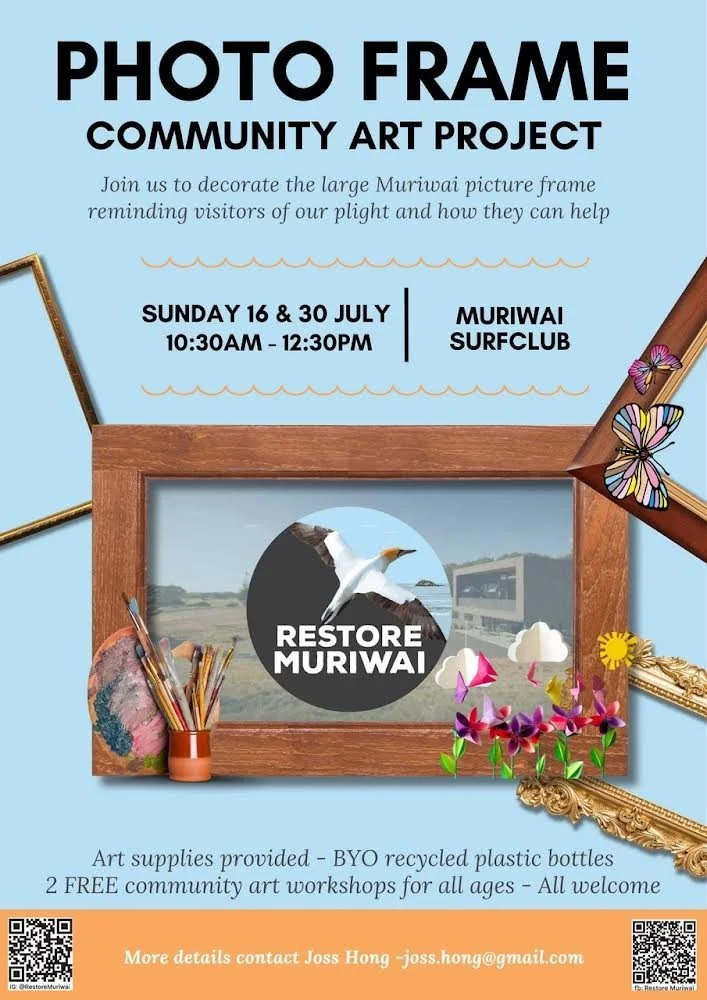 Led by jewellery artist Joss Hong, join us to make flowers from recycled plastic bottles. These will decorate a large wooden frame made by a Muriwai local. The frame will be erected in a public area in Muriwai for people to pose behind for photos.